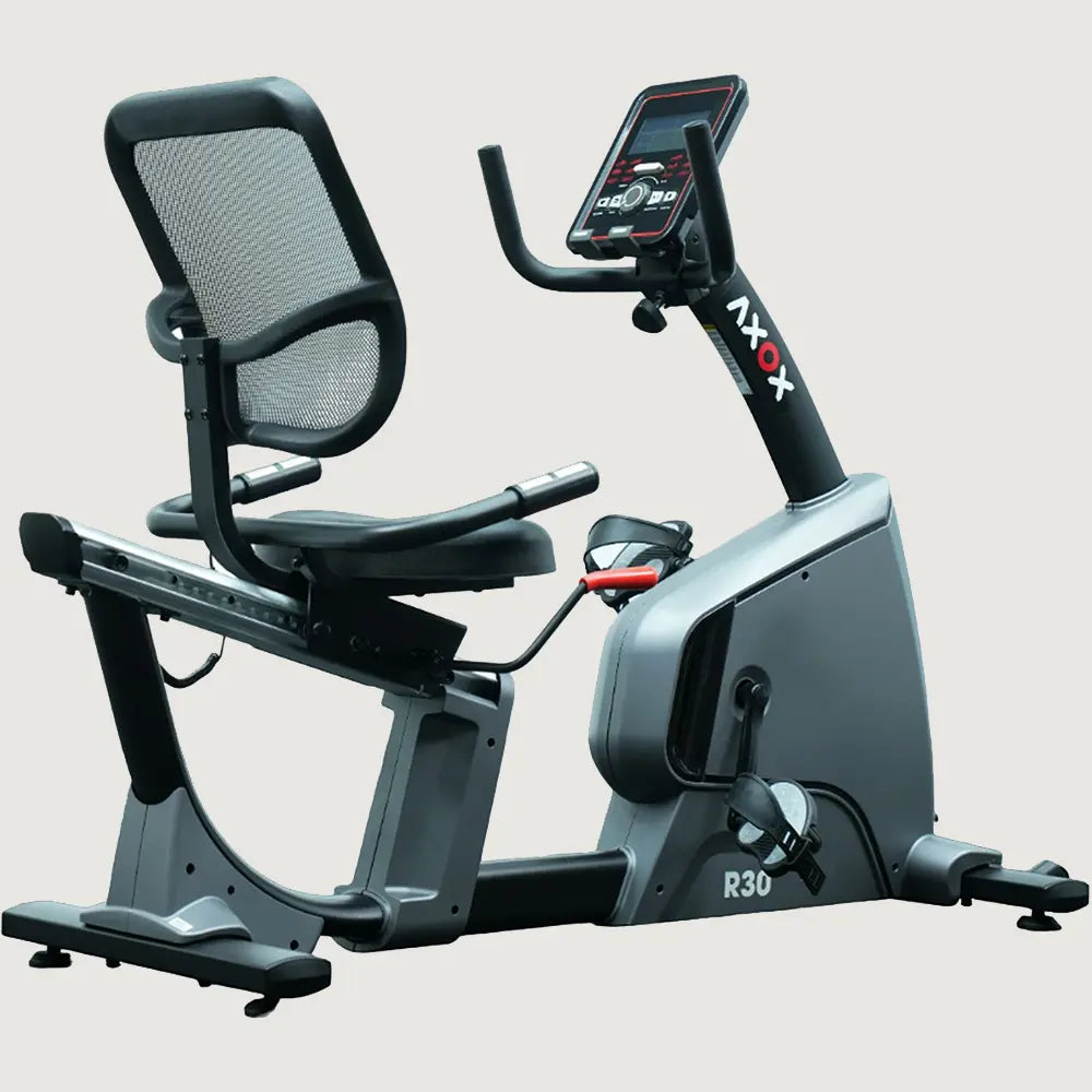 The Axox Fitness R30 Recumbent Bike delivers a smooth, low-impact workout with a comfortable design and advanced functionality. Equipped with a 9 kg flywheel and 32 magnetic resistance levels, it ensures customizable intensity for users of all fitness levels. The 5.5-inch LCD console provides real-time feedback on essential metrics, while 12 workout programs keep training sessions dynamic. With its supportive recumbent seating, mobile phone holder, foldable design, and transport wheels, the R30 is ideal for effective, comfortable, and convenient home workouts.