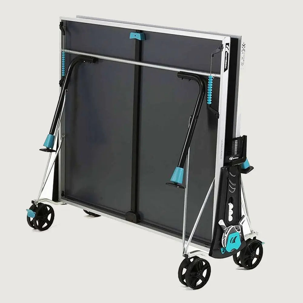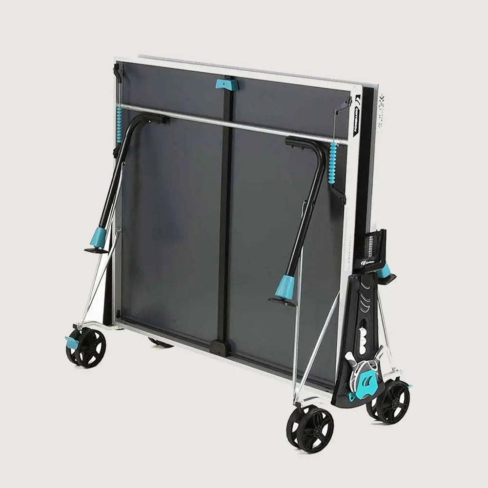 The Cornilleau 300X Outdoor Table Tennis Table combines versatility, durability, and precision for an exceptional outdoor playing experience. Designed with a 5 mm solid core resin laminate surface and SOFTMAT anti-glare finish, it ensures consistent bounce and clear visibility even under direct sunlight. The corrosion-resistant Aluzinc® frame and sturdy 38 mm legs provide long-lasting durability, while swivel pads adapt to uneven ground for maximum stability. With handy storage options, oversized double wheels for effortless portability, and the innovative COMPACT TECHNOLOGY® folding system, the 300X is simple to set up, transport, and store. Built to withstand rain, snow, and extreme heat, it is perfect for players of all levels, from casual family games to competitive matches.